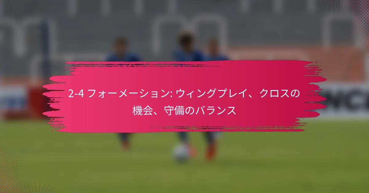 サッカーにおける2-4フォーメーションは、2人のディフェンダーと4人のミッドフィールダーを特徴とし、ウィングプレーと攻撃の機会を強調する戦術的なセットアップです。このフォーメーションは、フランクを活用しつつ、バランスの取れた守備構造を維持することを可能にします。